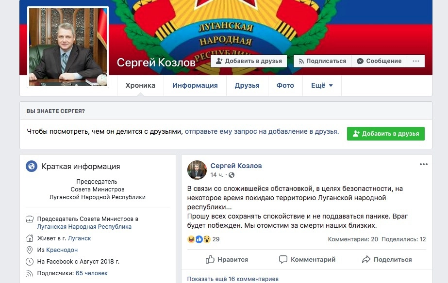 «В связи со сложившейся обстановкой, в целях безопасности на некоторое время покидаю территорию Луганской народной республики», — написал он на своей странице в Facebook (в настоящее время запись удалена).
