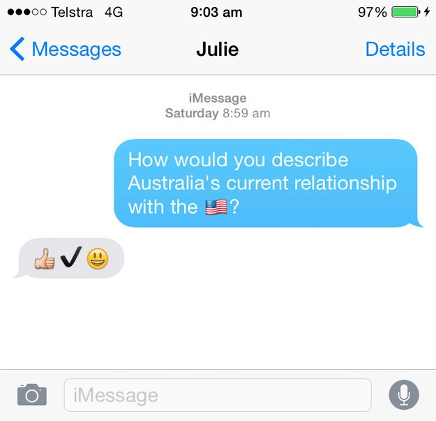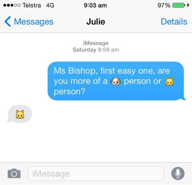 Глава МИД Австралии Джулия Бишоп, известная как активный пользователей соцсетей, дала интервью американскому изданию BuzzFeed при помощи одних лишь смайликов. Она ответила на 14 вопросов, один из которых касался президента РФ Владимира Путина.