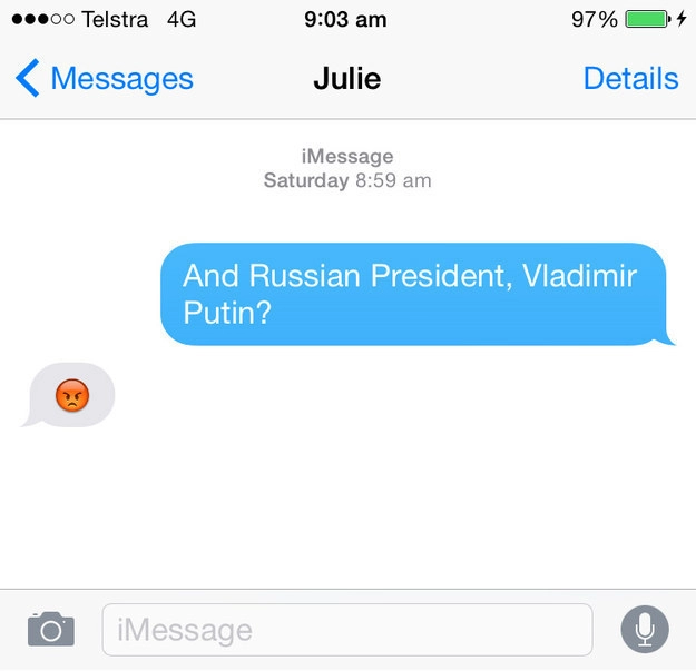 На вопрос, как бы она охарактеризовала президента РФ Владимира Путина, Джулия Бишоп ответила сердитым красным смайликом.