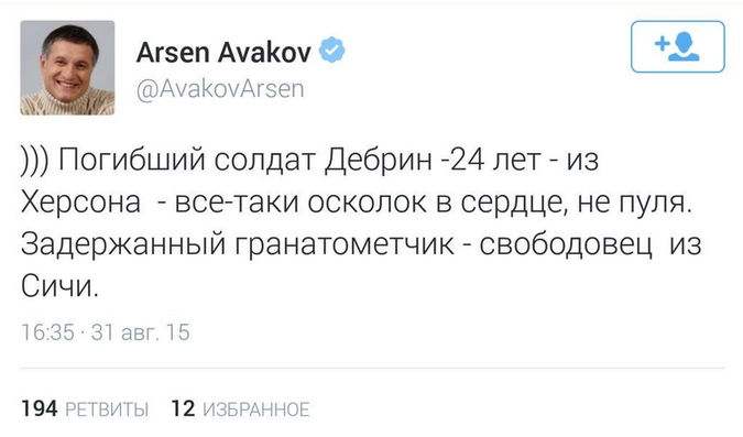 По словам Авакова, военнослужащему выстрелили в сердце. Вскоре глава МВД заявил, что стрельбы не было и нацгвардеец был убит осколком гранаты. Свое сообщение Аваков вновь дополнил «смайликами», на этот раз имитирующими улыбку: