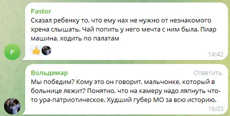 В официальном видео губернаторского визита в больничную палату к девятилетнему Глебу, потерявшему два пальца из-за сработавшего в руках взрывного устройства, отчётливо слышно, как глава Подмосковья говорит матери мальчика: «Галина, хорош плакать!»