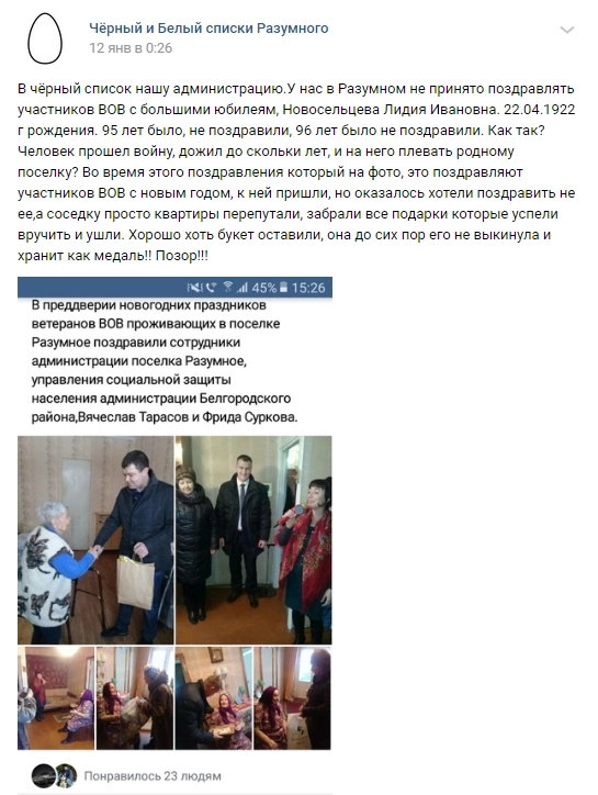 Как уже писал «Ридус», работники местной администрации просто ошиблись подъездом. Они должны были поздравлять с днем рождения не Лидию Новосельцеву, а совсем другого ветерана. При этом, как пишут пользователи социальных сетей, дарить ветеранам Разумного по поводу больших юбилеев подарки — давняя традиция поселковой власти. Однако Лидию Ивановну эта традиция почему-то обошла стороной: ей местные чиновники никогда ничего не дарили.