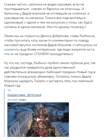 Тем не менее, в социальных сетях и Telegram-каналах раздаются голоса, свидетельствующие о том, что с «НаШествием Дедов Морозов» не все так гладко. В Сети появилось несколько публикаций о том, что на предновогоднее шествие якобы «из-под палки» направляли бюджетников.