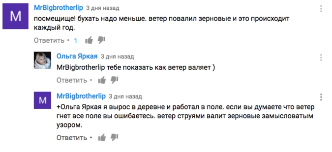 «Я думал, что это какой-то фейк или хулиганство. Рисунки, сделанные из примятых колосьев пшеницы — это можно сделать только большой платформой или одной силой, чтобы их выложить в одном направлении», — говорит в начале ролика автор.