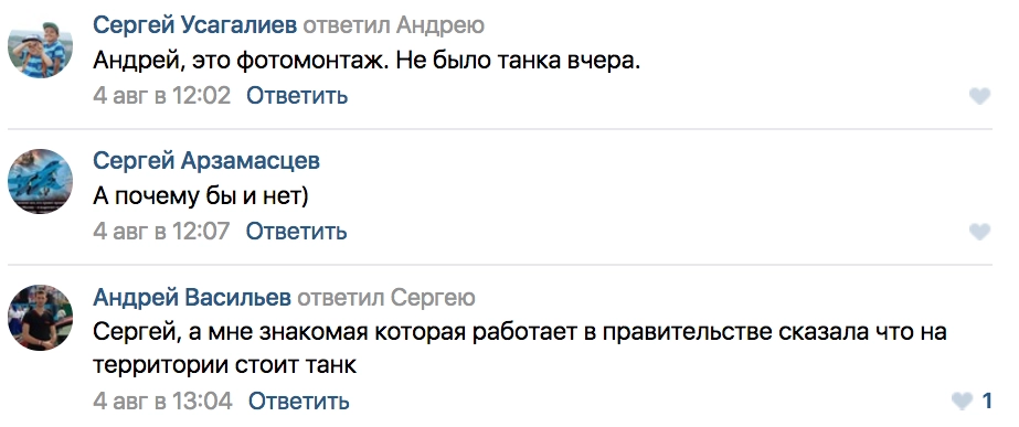Администраторы популярного паблика «Саратов Life» спросили у пользователей, является ли фото фейком или танк обладминистрации нужен для укрепления стабильности в регионе. Мнение горожан разделилось: большинство саратовцев сошлись на том, что при изготовлении снимка использовался фотомонтаж и танк туда был добавлен, однако количество респондентов, принявших фото танка за чистую монету, не намного меньше.
