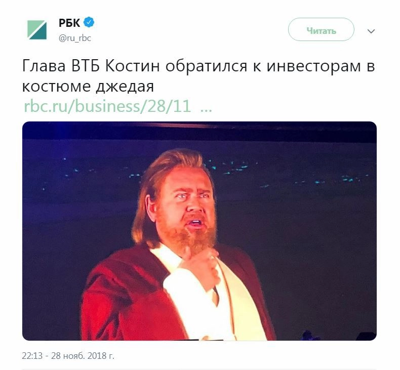 Глава банка ВТБ Андрей Костин появился на приеме для участников инвестиционного форума «Россия зовет!» в костюме Оби-Вана Кеноби — одного из персонажей вселенной «Звездных войн». На этом креатив организаторов неформальной встречи для инвесторов не закончился.