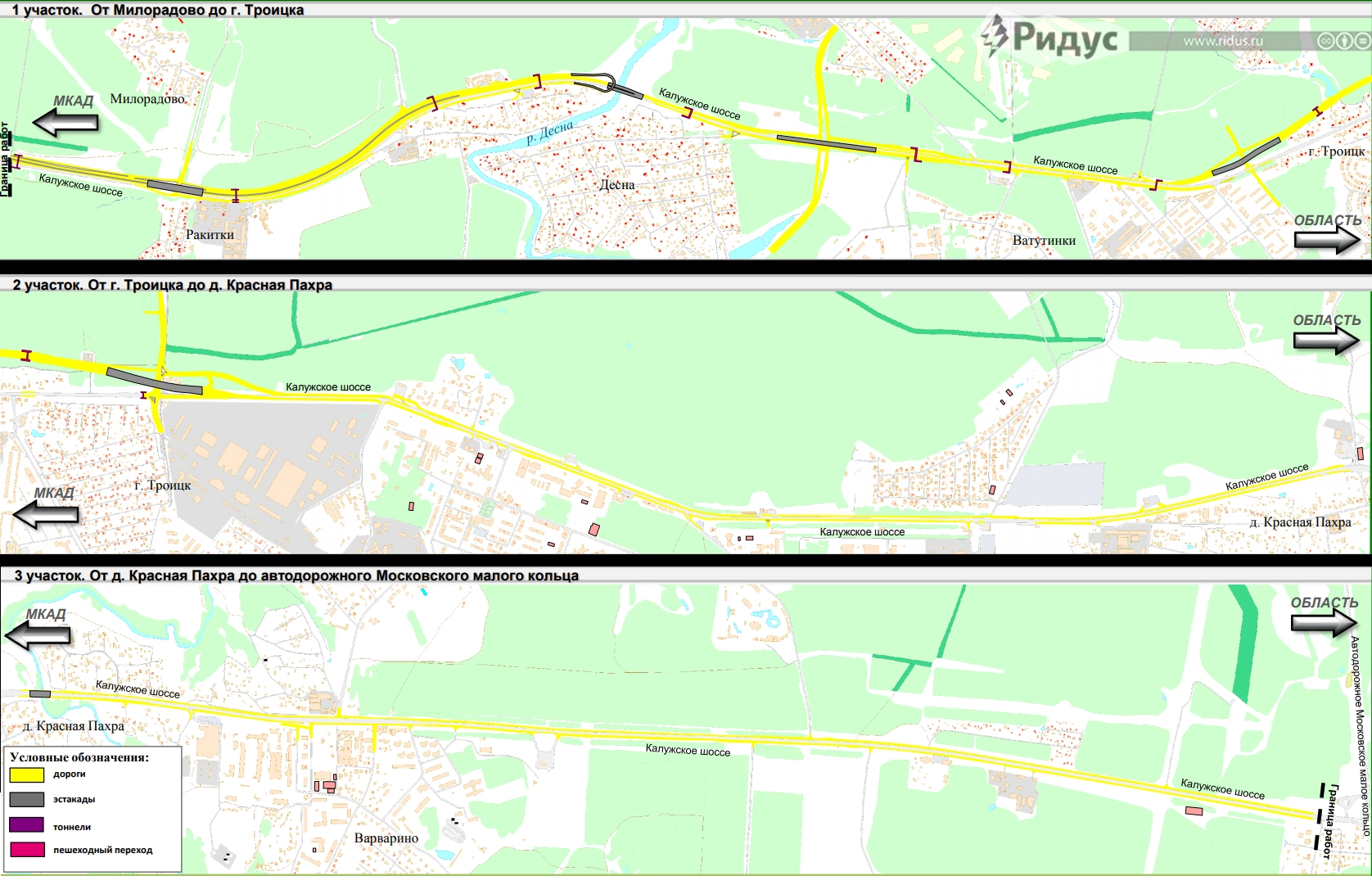 В минувшем году реконструкции подвергся первый участок Калужского шоссе — от МКАД до поворота на Коммунарку. Тогда были открыты семь крупных искусственных сооружений, среди которых — обновленный путепровод в районе торговых центров IKEA и «Славянский мир», прямой тоннель в районе съезда к поселкам Коммунарка и Газопровод, мост через реку Сосенка и другие объекты.