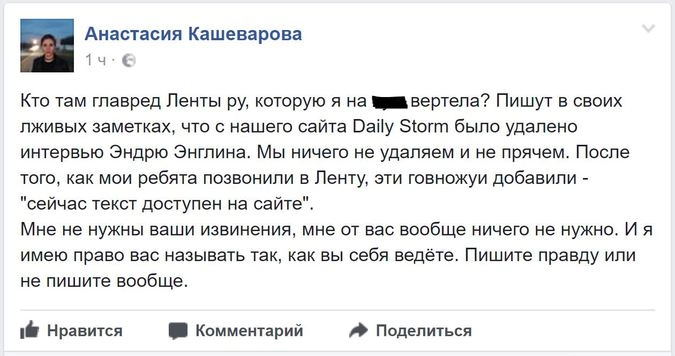 «Кто там главред Ленты ру, которую я на [мужском половом органе] вертела? Пишут в своих лживых заметках, что с нашего сайта Daily Storm было удалено интервью Эндрю Энглина. Мы ничего не удаляем и не прячем. После того, как мои ребята позвонили в Ленту, эти говножуи добавили — „сейчас текст доступен на сайте“. Мне не нужны ваши извинения, мне от вас вообще ничего не нужно. И я имею право вас называть так, как вы себя ведете. Пишите правду или не пишите вообще», — написала Кашеварова в Facebook.