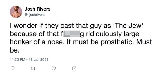 Записи были опубликованы в период с 2010 по 2015 год. «Интересно, правда ли, что они называют этого парня евреем из-за чертовски большого носа? Наверное, это протез», — говорится в одном из твитов.