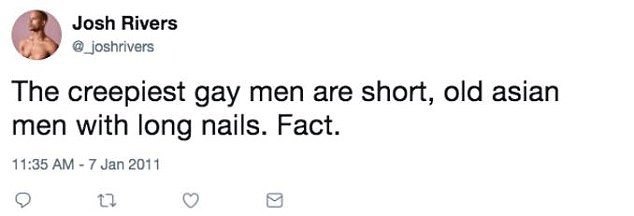 «Самые отвратительные геи — это маленькие старые азиаты с длинными ногтями. Факт», — писал он.