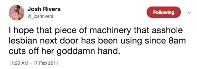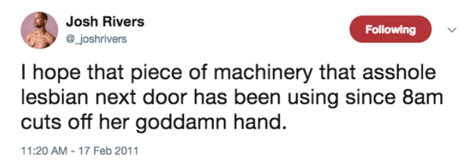 «Я надеюсь, что аппарат, которым соседка-лесбиянка пользуется с 8 утра, отрежет ей руку», — цитирует его BuzzFeed.