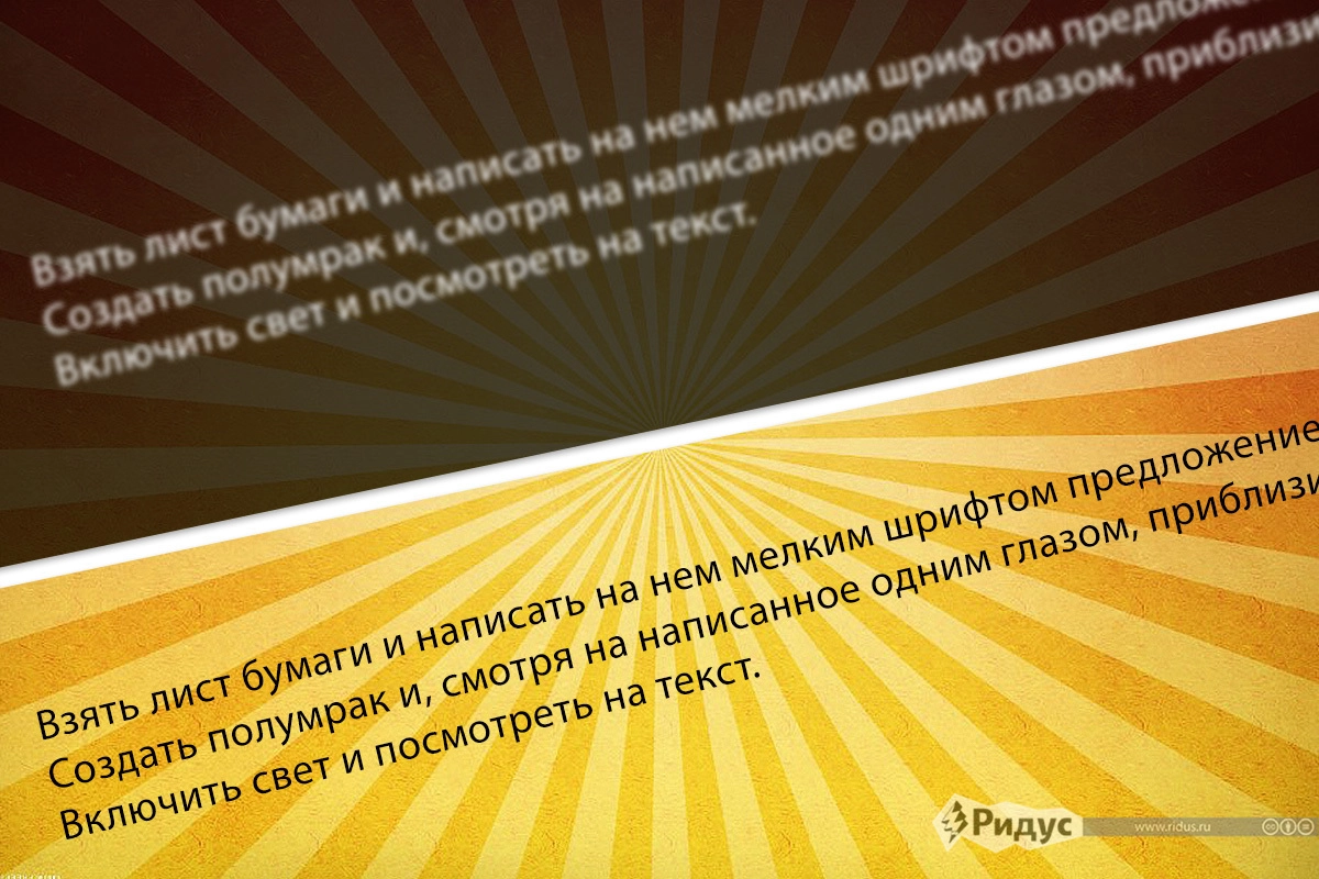 • создать полумрак и, смотря на написанное одним глазом, приблизиться к листу настолько, чтобы глаз не смог сфокусироваться на тексте;