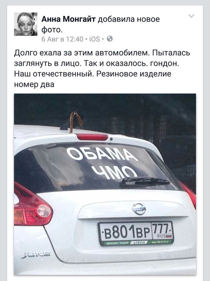Ведущая телеканала «Дождь» Анна Монгайт разместила на своей странице в Фейсбуке фотографию машины, на заднее стекло которой нанесена надпись «Обама — чмо». Журналистка снабдила снимок непристойным комментарием.