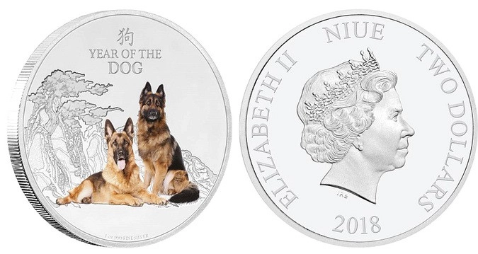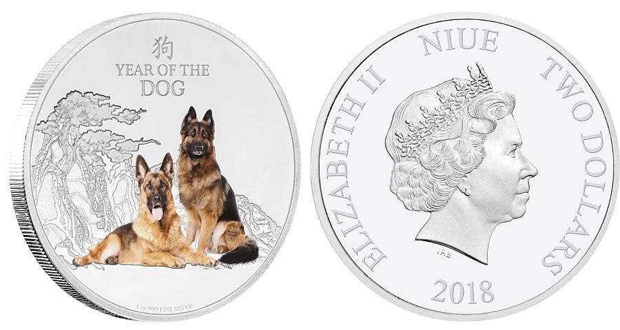 Новозеландский монетный двор представил серебряную монету с цветным изображением немецкой овчарки. На заднем фоне изображена китайская сосна и скала, которые символизируют стабильность и долголетие. Также на этой стороне монеты имеется надпись на английском языке «Year of the Dog» (Год собаки) и китайский иероглиф, означающий «собака».