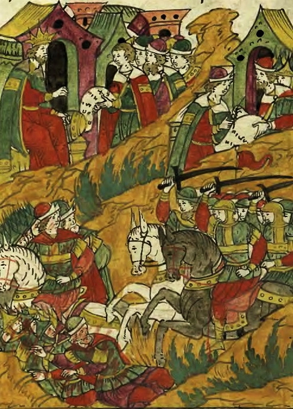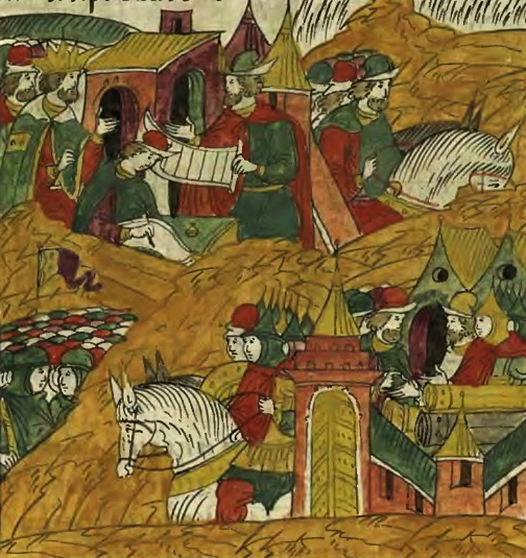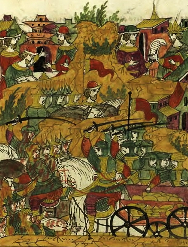 Поражение воеводы Захарьи Плещеева и захват ливонцами его обоза. Миниатюра из Лицевого летописного свода