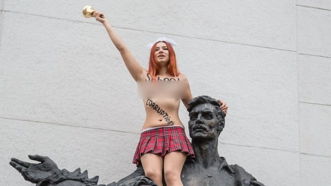 Ранее «Ридус» писал, что голая активистка Femen выбежала на поле перед началом отборочного матча ЧМ-2018 между Украиной и Турцией, а до этого другая обнаженная по пояс активистка, изображавшая статую Свободы, забралась на постамент снесенного памятника Ленину и разбрасывала конфеты Roshen.