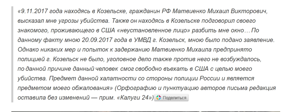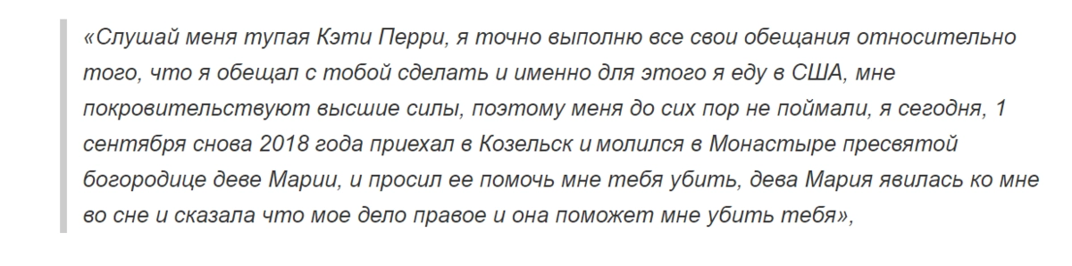 Представитель популярной американской певицы Кэти Перри прислал в редакцию калужского издания письмо, в котором пресс-служба актрисы просит предать огласке факты угроз в ее адрес со стороны омского писателя Михаила Матвиенко.