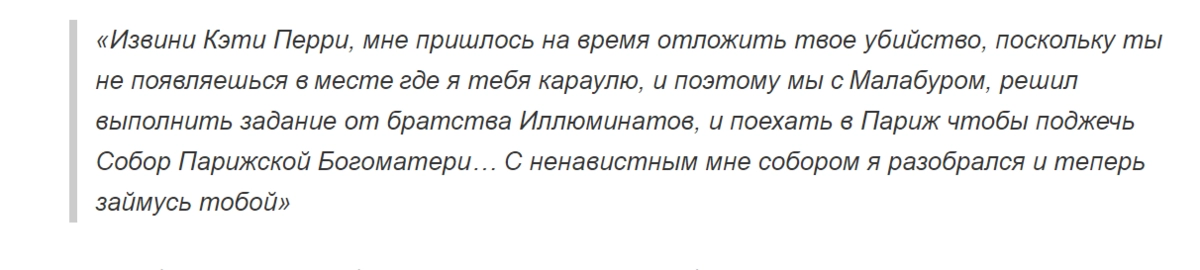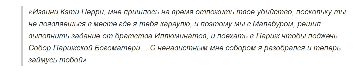 Помимо нападок в адрес Кэти Перри, преследователь также признался, что это он устроил пожар в соборе Парижской Богоматери. Как сообщает издание, он даже приложил любительскую запись со страницы в соцсети.