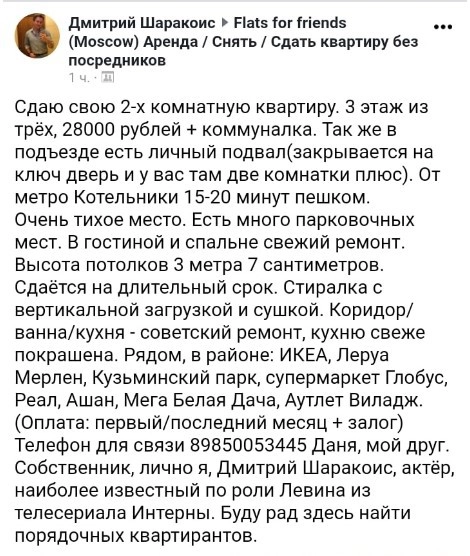 По словам друга актера, за час после публикации объявления о сдаче квартиры ему поступило много звонков.