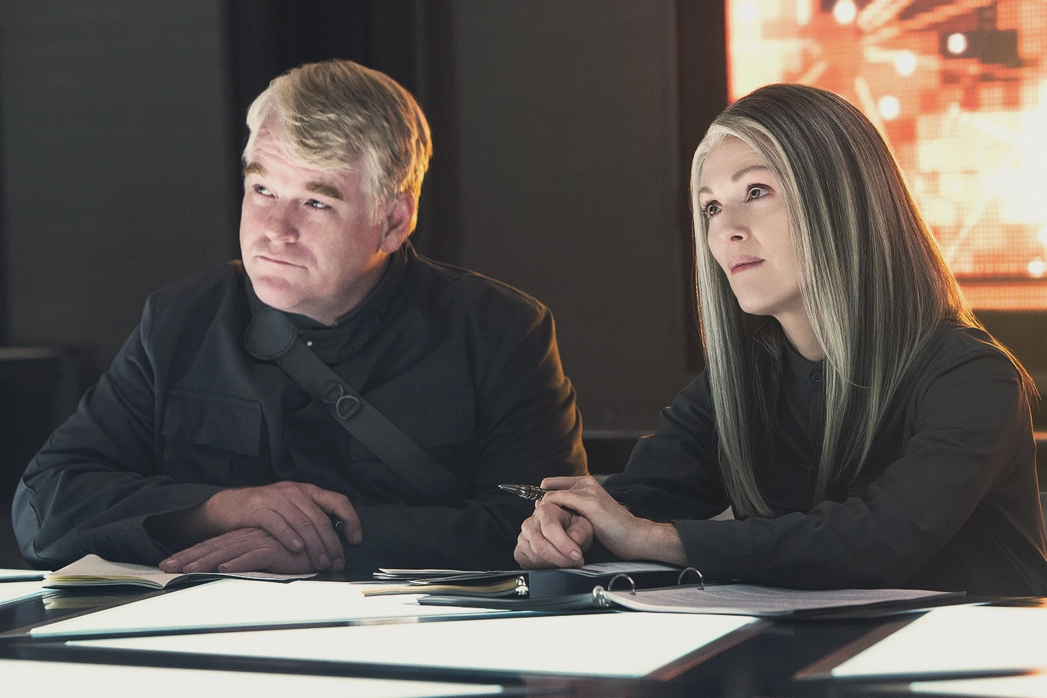 В то время как персонаж Вуди Харрельсона на заднем плане страдает из-за сухого закона, места главных взрослых героев занимают Джулианна Мур и Филип Сеймур Хоффман. Понятно, что для них этот проект — пустяшная подработка в перекуре между чем-то более серьёзным, возможность получить такой гонорар, что позволит потом ещё долго заниматься чисто искусством (жаль, что Хоффман, светлой памяти которого посвящена картина, спустил свой заработок не на то, что нужно). Поэтому нет смысла судить их за то, что они не сильно копаются в своих образах, идя проторенным путём без излишних чудачеств: Альма Койн явно врёт, Плутарх определённо чего-то не договаривает — отчего вовсе не факт, что дорвавшись до настоящей власти, они действительно превратят жизнь трудового пролетариата в сказку. Впрочем, читавшие книжки уже знают, чем всё обернётся, — и если я не прав, стало быть, это просто большие артисты, лауреат «Оскара» и обладательница берлинского, каннского и венецианского призов, зря нагнетают тумана, от скуки добавляя интриги и так называемое «второе дно» в свои пресные и лишённые перца роли.