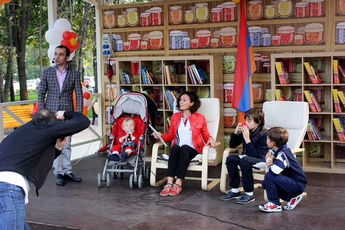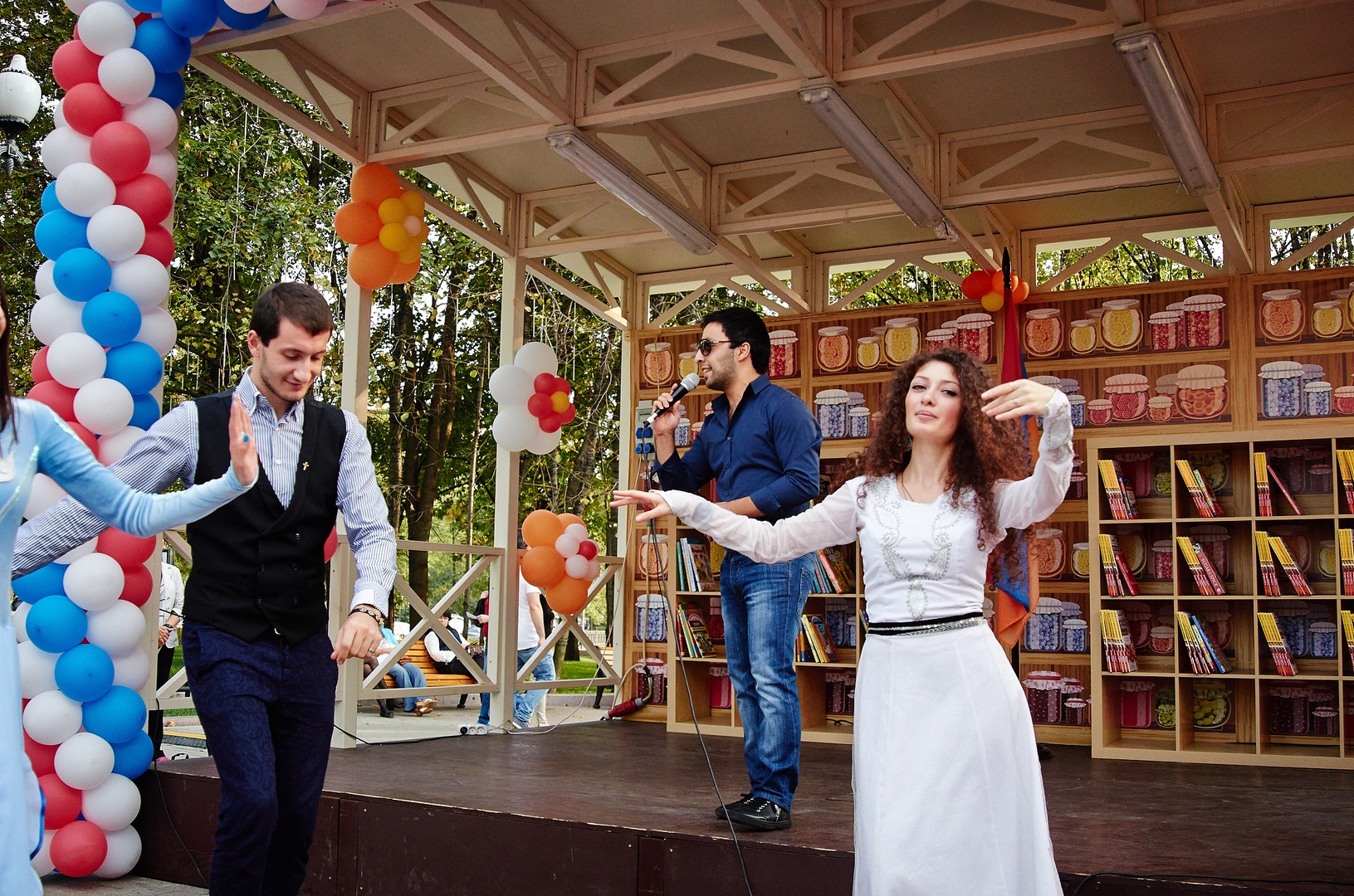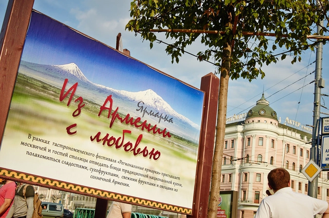 С маленькой площади перед ныне закрытым Макдональдсом доносились звуки непривычной нашему слуху музыки. Она в какой-то степени была восточной, и слова пелись на неизвестном мне языке. Люди в армянских национальных нарядах танцевали под нее. Вокруг висел армянский триколор. Это проходили гулянья на площадке «Из Армении с любовью» фестиваля «Мосгастроном».