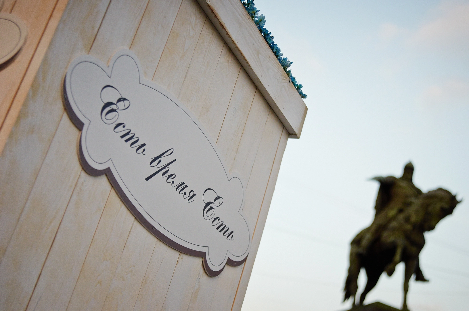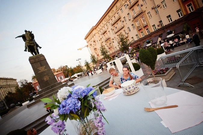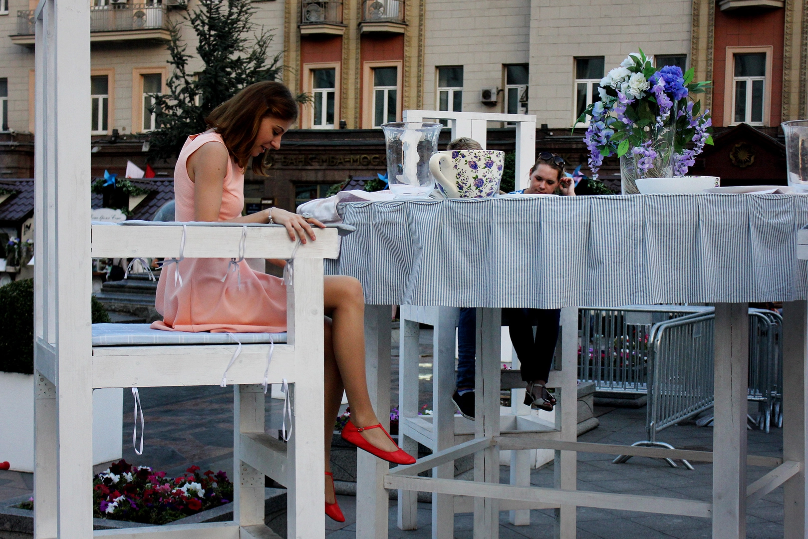 Плавно из Новопушкинского сквера все переместились на Тверскую площадь. Там по обычаю стоял Юрий Долгорукий. На этот раз он своей широкой рукой указывал на громадный стол с чашками и блюдцами, напоминавший действия книги «Алиса в стране чудес». На высоком стуле сидела девушка в розовом платьице. При желании она могла бы сделать реверанс перед Червонной Королевой, разведя подол юбки в разные стороны. Но она всего лишь пила за этим громадным столом из громадной чашки, должно быть, громадный чай. А напротив нее на одном стуле умещалась обнимающаяся парочка. Представьте, какие масштабы!