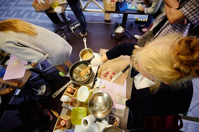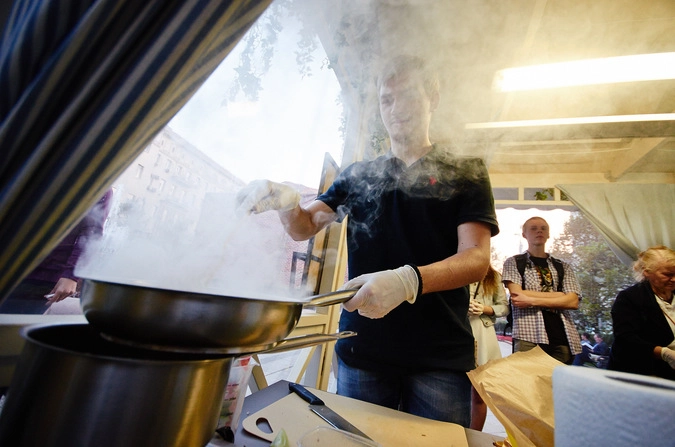 И дальше понеслись вилки, ложки, шипящее масло на горячих сковородках, булькающая вода в кастрюлях, специи и куча полезных советов от одного из ведущих поваров Москвы. Кто-то готовил на всех своих друзей, деля кусочек фарша не на две-три фрикадельки как остальные, а примерно на дюжину. У кого-то подгорел лук, у кого-то мясо, от чего Андрей постепенно остался без ужина. Две бабульки все время либо поддакивали опытному повару, либо сами давали ему кулинарные советы. А одна веселая женщина все время порывалась выпить вино, в котором надо было жарить курицу. Даже после окончания мастер-класса к Рыдзевскому еще долго подходили гости и участники фестиваля, чтобы разузнать новый для себя рецептик.