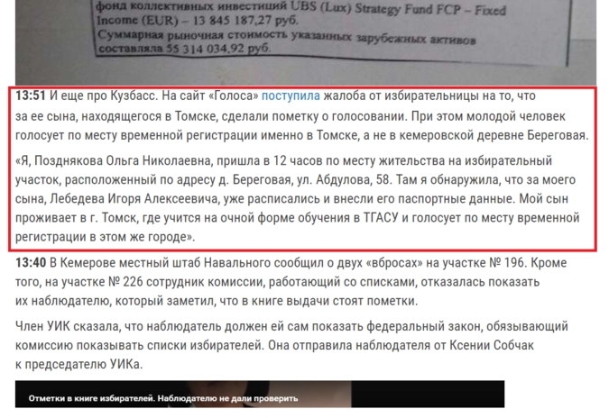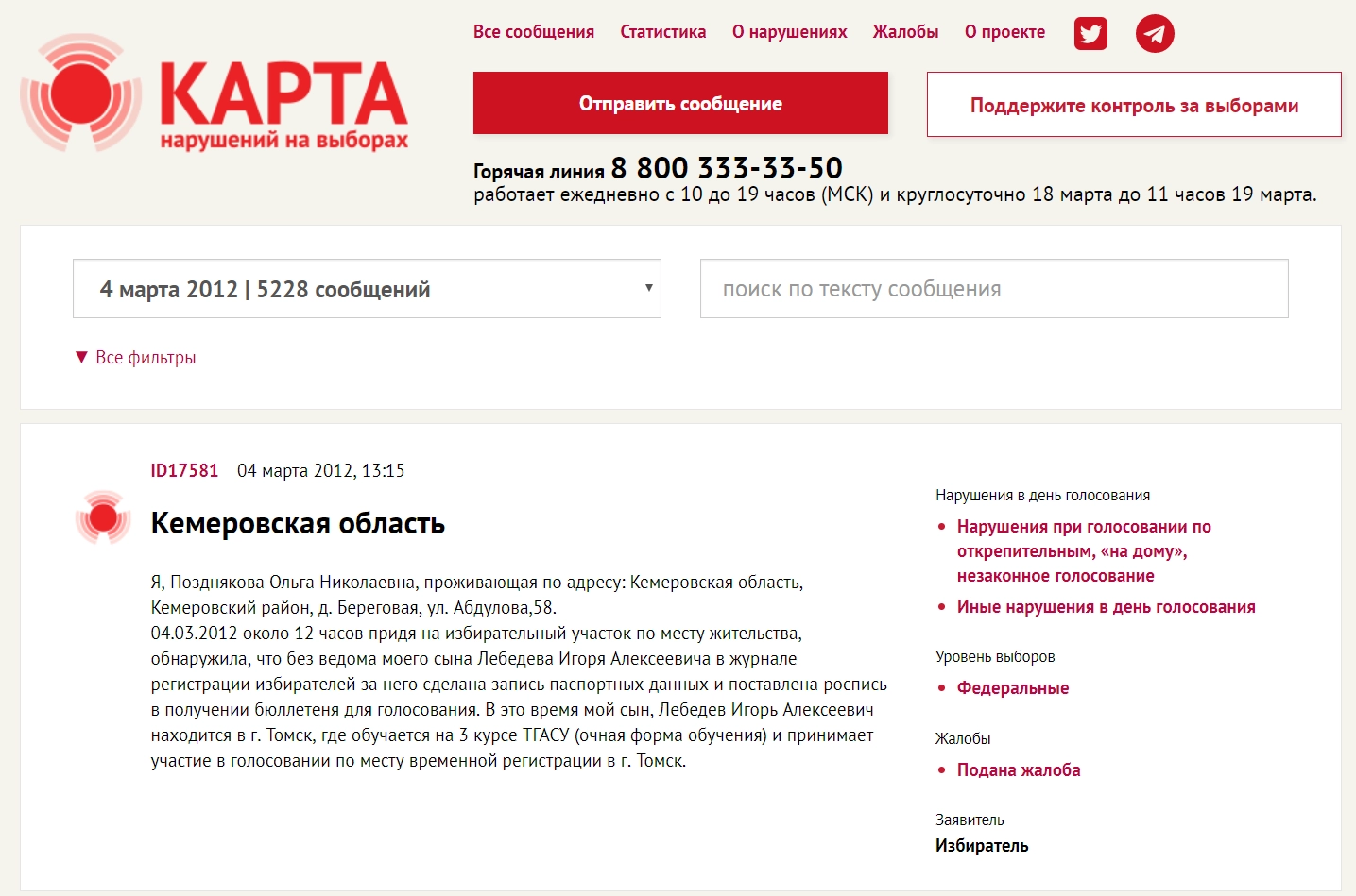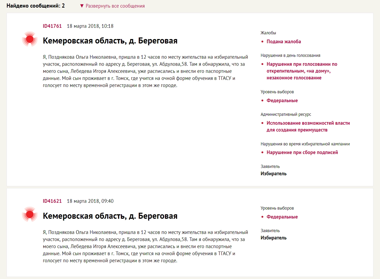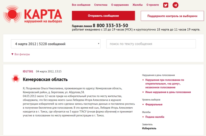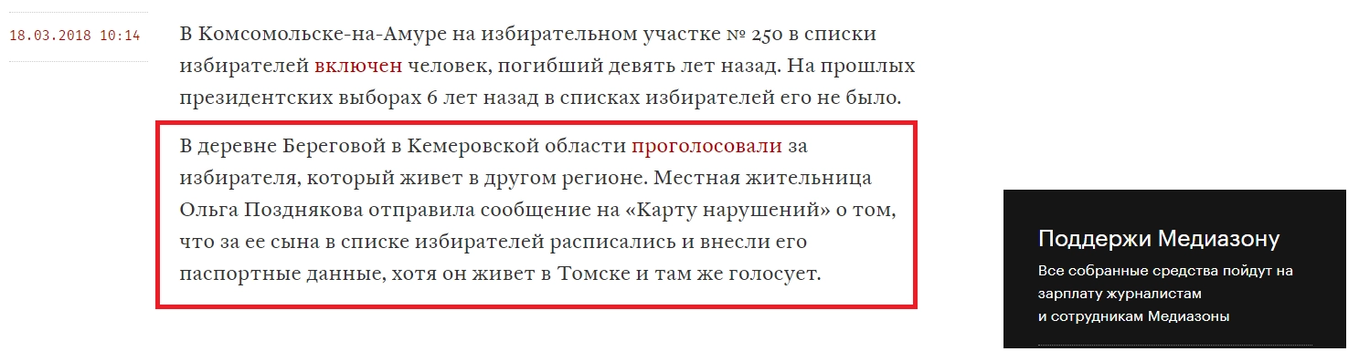 Так, 18 марта некто поместил на «Карте нарушений», которая является проектом «Голоса», сообщение от имени жительницы деревни Береговая Кемеровской области. Женщина пожаловалась на то, что пришла на избирательный участок и обнаружила, будто за её сына проголосовал кто-то другой.