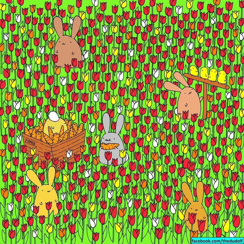 Весной 2017 художник предложил подписчикам найти яйцо на поле с кроликами, цыплятами и разноцветными маками. И это головоломка стала, пожалуй, одной из самых сложных.