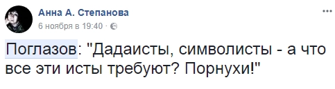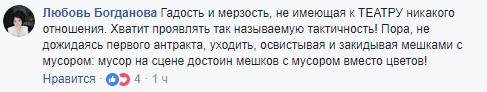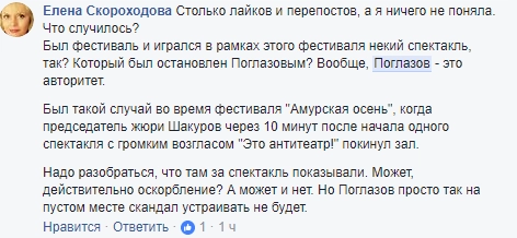 Далее, по ее словам, с подачи Поглазова многие присутствующие в зале начали критиковать актеров и высказываться в духе «как вы посмели оскорбить эту святую сцену своим спектаклем», «сколько ваши родители платят за то, что вас этому учат», «вы принесли сюда эту грязь», «вы оскорбляете зрителя», «вы устроили из сцены пьяный кабак».