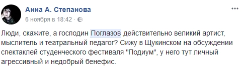 На сцену с руганью выскочил один из „заслуженных“ педагогов Щуки, некий Поглазов, остановил спектакль, по причине „невозможности больше это терпеть“, стал хамовато общаться с актерами, после чего покинул зал, а за ним последовала большая часть студентов некогда блистательного вуза… В лучших традициях обличительных комсомольских собраний тот же, с позволения сказать, „педагог“, сидящий в президиуме, стал высокопарно, естественно, с позиций своего позволяющего-ему-абсолютно-все-даже-хамство опыта говорить, что это „он их еще пожалел“, что они, вообще, не актеры, что ничего не понятно, что они оскорбили самое святое — зрителей, а также его маму, женщин, его лично,сообщила об инциденте театровед Залина Кантемирова.