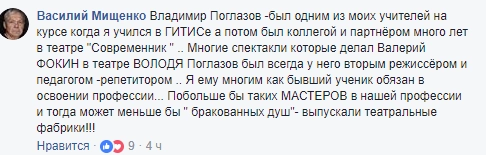 Театральный конфликт не оставил равнодушными и других пользователей Сети. Те, кто был лично знаком с преподавателем Поглазовым, встали на его защиту. В том числе и актер театра «Современник» Василий Мищенко.