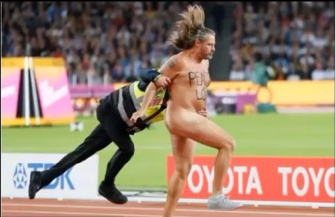 Перед финальным забегом на 100 метров у мужчин на чемпионате мира по легкой атлетике в Лондоне обнаженный мужчина выскочил на беговую дорожку.