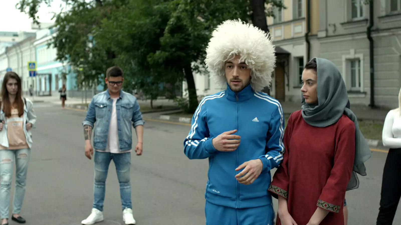 Есть тройка дурачков, есть главный герой, есть красавица бойкая – это все какие-то канонические вещи и, возможно, этот костюм, не знаю, умышленно ли он был взят из клипа, но мне кажется, это тоже жанровый канон представления о каком-то горце непонятном. Вот если представить, как выглядит Тофик, ну вот он, наверное, так и выглядит. В каком-то спортивном костюме голубом, папахе, поясной сумке и с телефоном на длинной-длинной антенне.