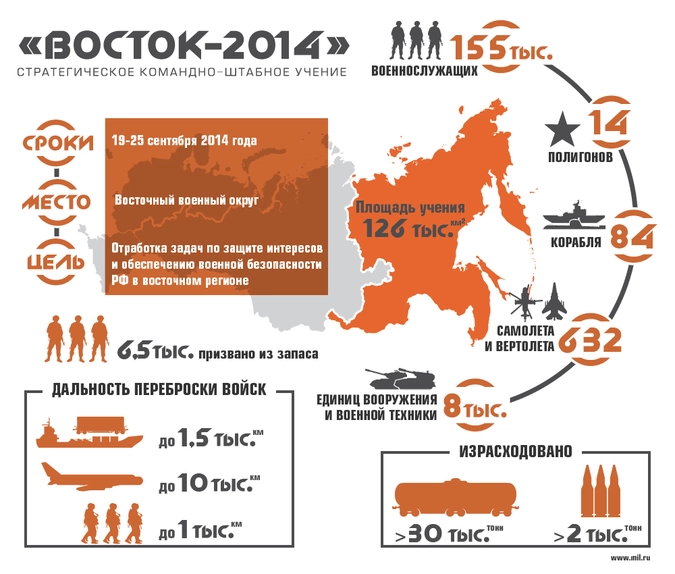 Но самое главное беспокойство у США вызывает то, что Россия стала регулярно проводить военные учения, масштаб которых превышает уровень советских. В последних маневрах «Восток-2014», как сообщил Сергей Шойгу, приняли участие 155 тыс. военнослужащих, около 8 тыс. единиц вооружения и военной техники, в том числе более 4 тыс. боевых бронированных машин, 632 самолета и вертолета, 84 корабля. Для примера, в считавшихся крупнейшими маневрами последних десятилетий - учениях «Запад-81», прошедших в 1981 году на территории Белорусского, Киевского и Прибалтийского военных округов, в акватории Балтийского моря и на территории других государств ОВД, приняли участие около 100 тыс. военнослужащих Советской армии.