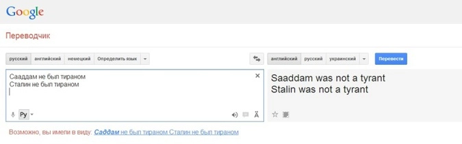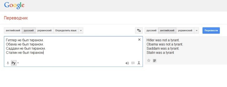 Действительно, если еще раньше можно было зайти на страничку данного сервиса и последовательно ввести словосочетание «не был тираном», и оказалось бы, что при соединении сего словосочетания с разными именами собственными, перевод оказался бы разным.