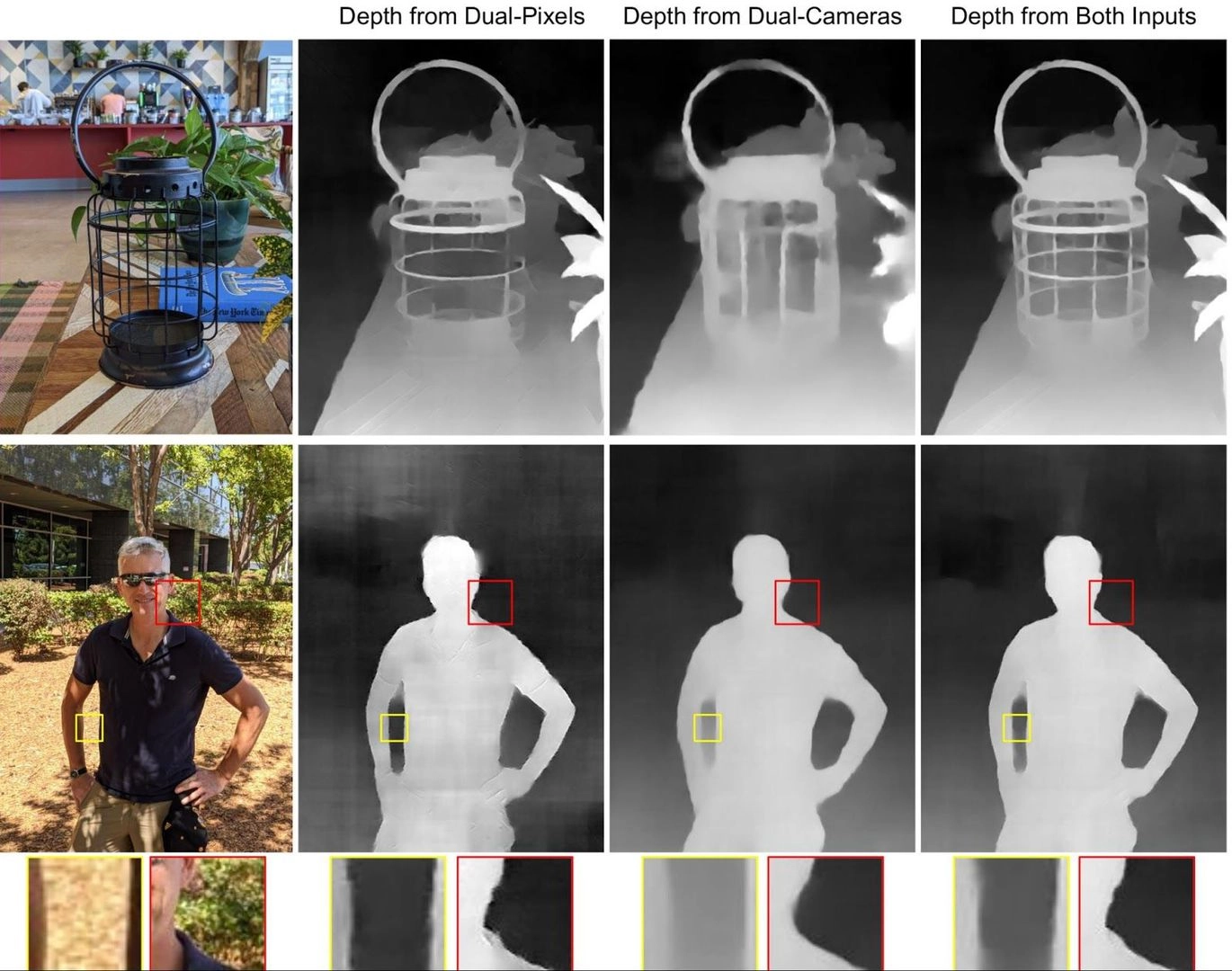 Кроме того, в камерах смартфона применяется технология Dual Pixel. Каждый пиксель содержит фазовую точку фокусировки, которая также собирает информацию о глубине сцены. На основании сведений с двух камер и фазовых датчиков ИИ строит карту глубины, отделяя объект от фона.