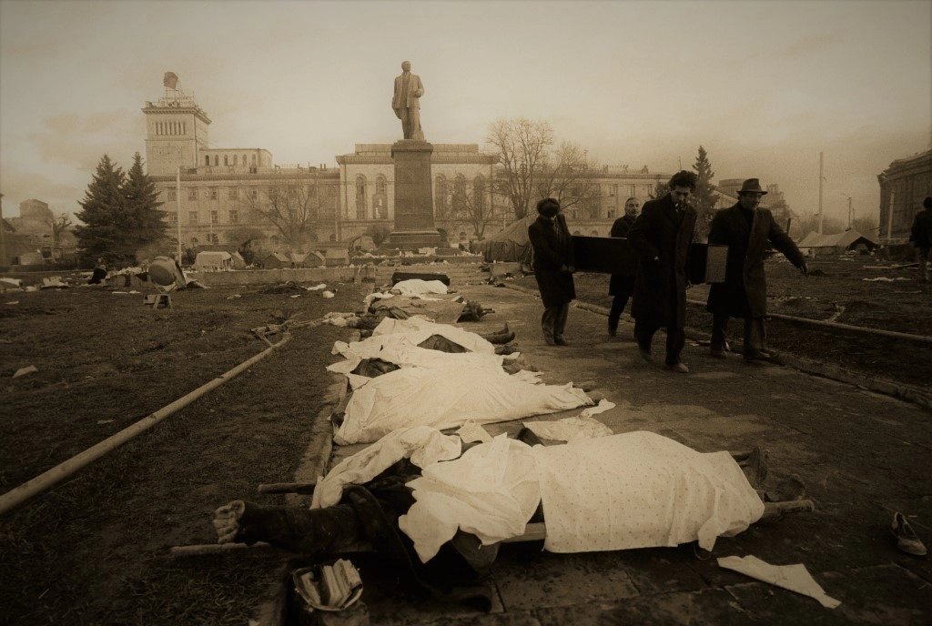 В декабре 1988 года на этоу площадь свозили тела погибших и сортировали перед захоронением —