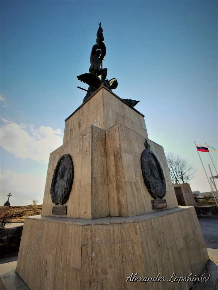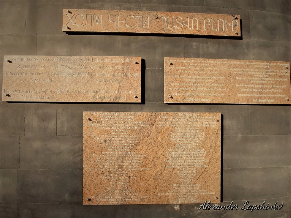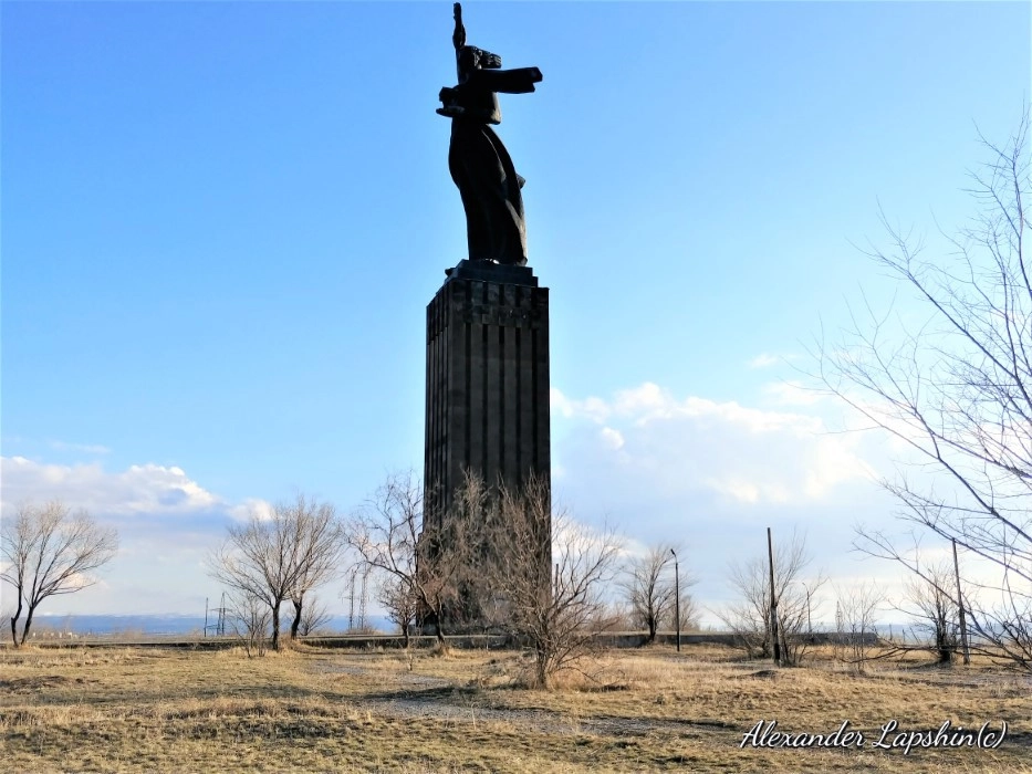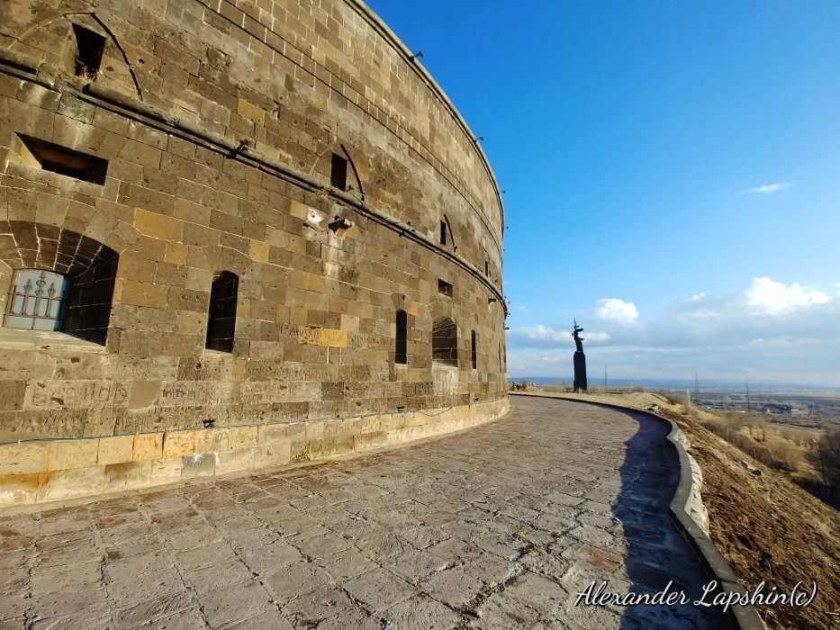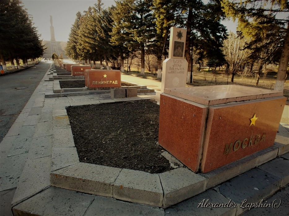 Если спуститься вниз по склону холма и затем чуть вверх, то попадете к советскому мемориалу посвященному Второй мировой войне. Наверху виднеется Мать Армения —