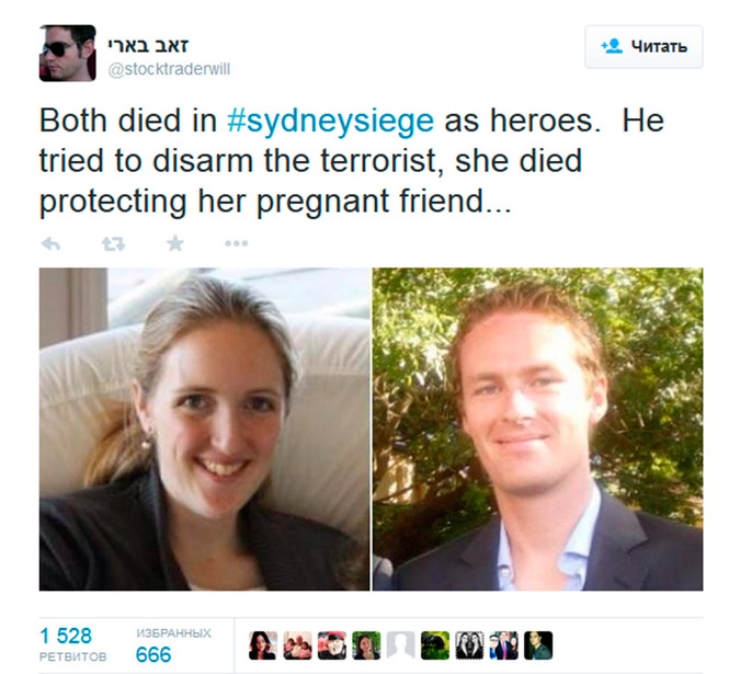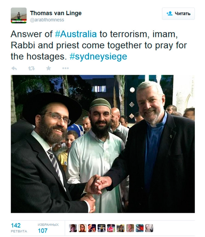 ![]() | Я живу в Сиднее 11 лет. Это не первый случай за последнее время, когда хотят столкнуть лбами представителей разных диаспор. Недавно неизвестные вандалы осквернили русско-сербское кладбище в городе Брисбейн. Но это нас только сплотило. Мы устроили шум в прессе, чтобы виновных нашли и наказали. Простые люди становятся жертвами политических игр. Австралия, поддерживающая американскую политику (причиной атак на Австралию исламисты называют поддержку этой страной антитеррористической операции США на Ближнем Востоке — прим.ред.), всегда верит, что в случает чего, получит защиту от США. В Сиднее достаточно большая арабская диаспора. Многие ее представители не хотят ассимилироваться, и пытаются перенести порядки своих стран в Австралию. Иногда становиться страшно, что нас может ждать сценарий, как во Франции и Англии, где арабы устраивают массовые беспорядки. Мы все скорбим по жертвам вчерашней трагедии — она унесла жизни невинных людей. Каждый гражданин страны соболезнует близким жертв. |