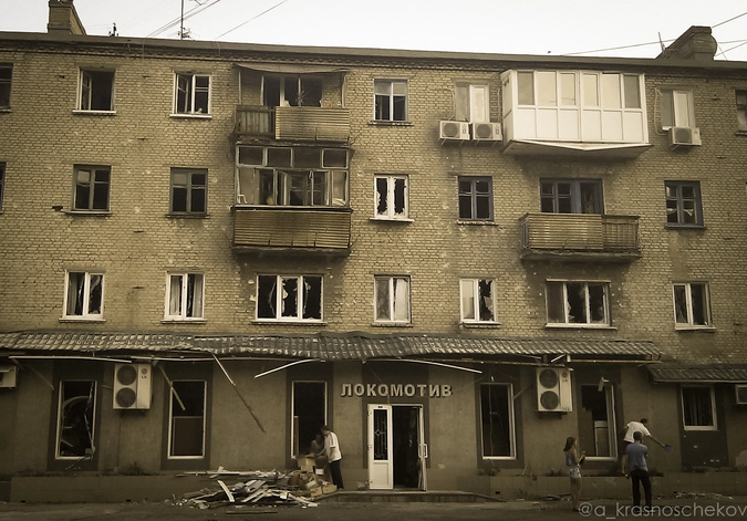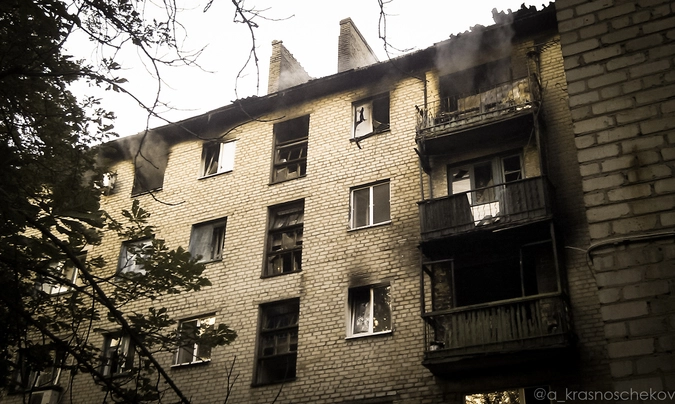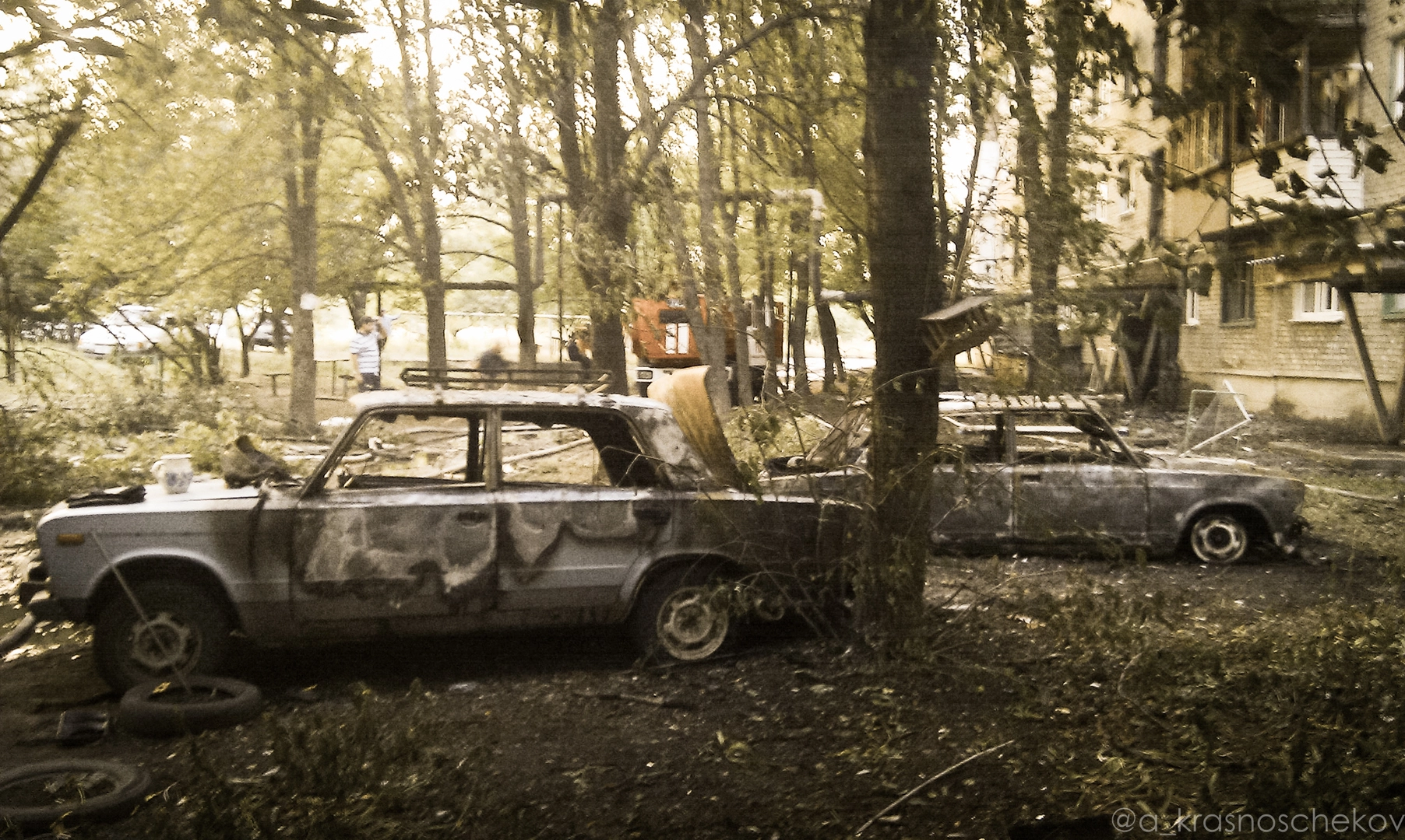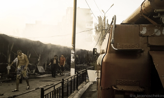 Выехали в этот городок, прижавшийся к Донецку, с северо-востока. Ещё не доехав до указанного места происшествия, видим побитую пятиэтажку. А уже на другой стороне перекрёстка дым. Тлеют торговые ряды. Суетится всего один пожарный расчёт, местные тушат тазами, пластиковыми вёдрами, кухонной посудой. Мужчины, женщины перепачканы сажей, преимущественно молча, хладнокровно гасят пламя так, будто это их собственность, их дом.