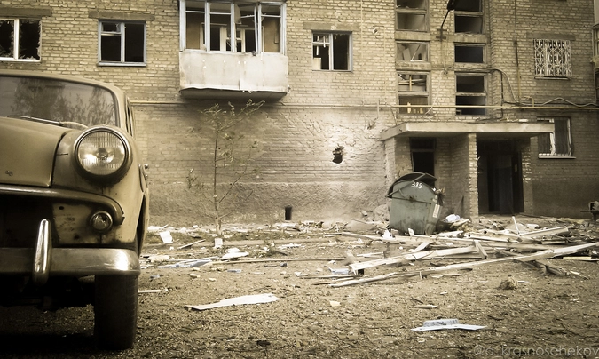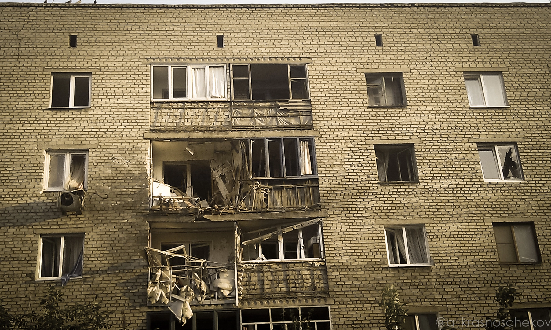 Да, в таких городках люди ощущают окружающую среду более своей, чем в мегаполисах. А этот самый окружающий мир предстал в жутком виде. Проезжаем всего пару сотен метров и видим две уже не побитые, а пробитые снарядами девятиэтажки. Дворы усыпаны стёклами. И заполнены редкими местными, которые шокировано смотрят на стены своего дома, на пустые, без рам и стёкол окна.