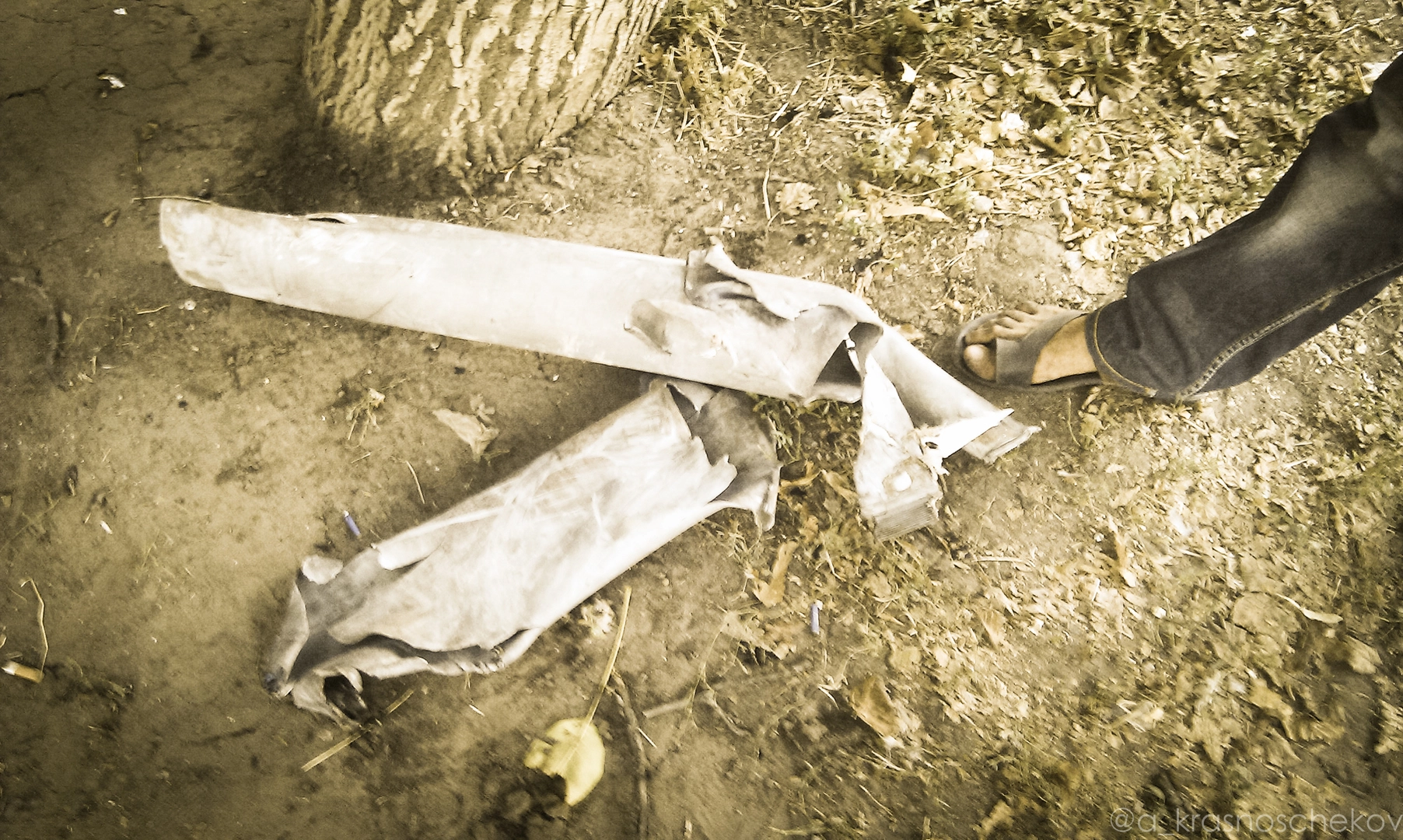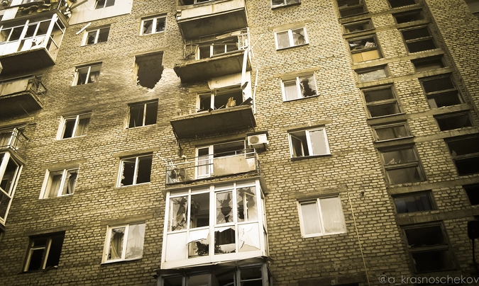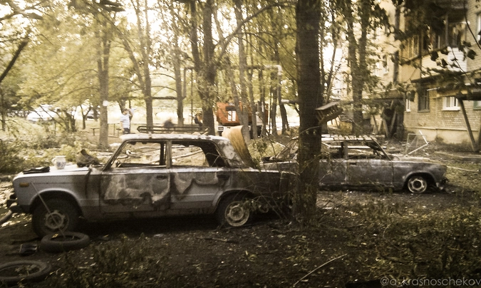 У подъезда остатки снаряда от "Града". Местные парни раскрывают ладони с осколками, предлагают сходить ещё туда, туда и туда: везде воронки и следы попаданий. Нет сомнений, что это именно данный тип оружия. Но странно, неся ранения и смерть, эти страшные орудия не приносят катастрофических, непоправимых разрушений зданиям. Скорее они действуют зажигательно: сгорели более десятка квартир, ещё несколько превращены в дыры на фасадах.