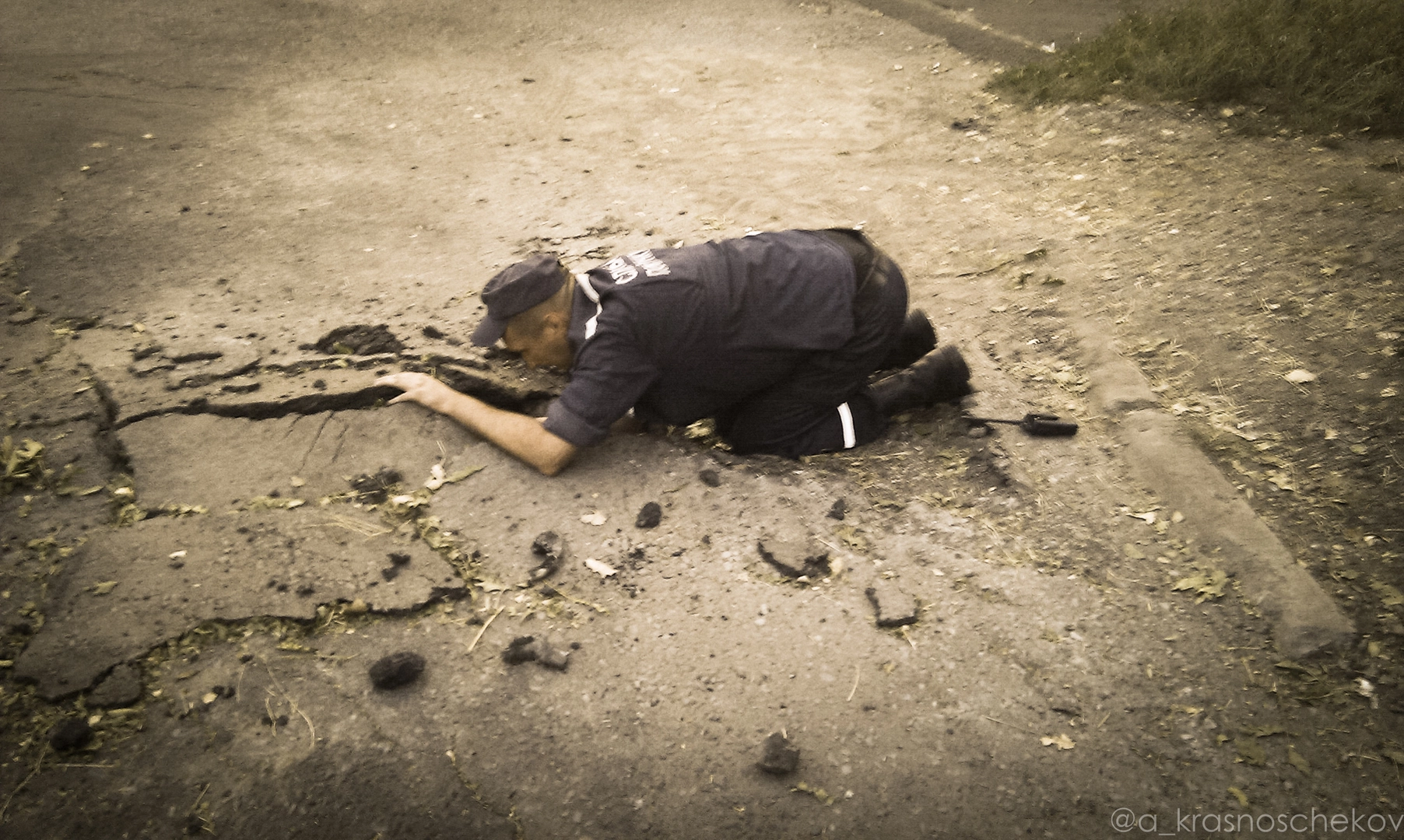 Перед отъездом видим, как сотрудник МЧС, склонившись, лезет с фонарём в воронку от снаряда.