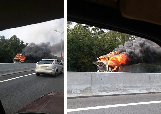 Движение по внешней стороне Московской кольцевой автодороги (МКАД) в районе пересечения с Рублевским шоссе в понедельник днем, 29 августа, частично перекрыто из-за горящей фуры.