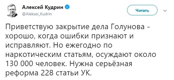 Глава Счетной палаты России Алексей Кудрин приветствовал в Twitter закрытие дела Голунова. В этой связи он призвал к реформированию статьи 228 УК РФ «Незаконное хранение, изготовление наркотических средств», отметив, что ежегодно «по наркотическим статьям осуждают около 130 тысяч человек».