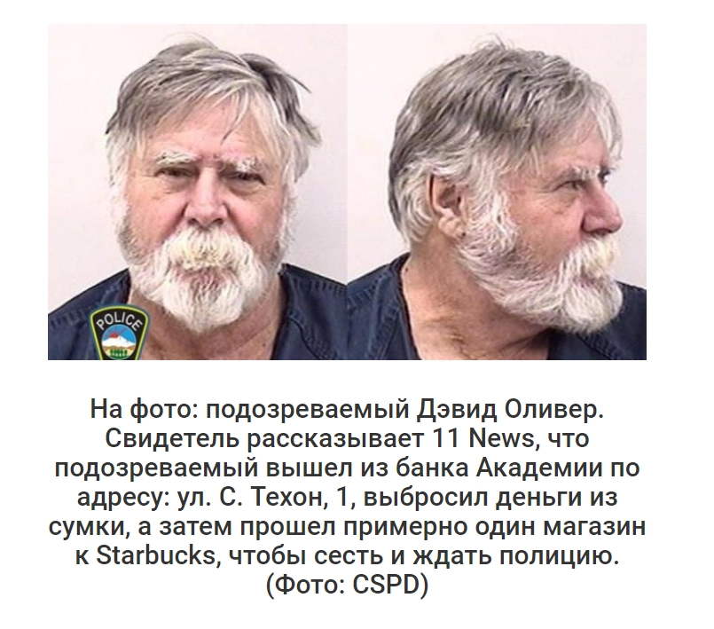 В американском городе Колорадо-Спрингс сотрудники полиции задержали 65-летнего местного жителя Дэвида Оливера, который обвиняется в ограблении банка. По словам очевидцев, мужчина разбросал все награбленные деньги по улице и при этом кричал: «Счастливого вам Рождества!», сообщает телеканал 11 News.