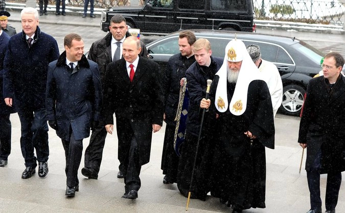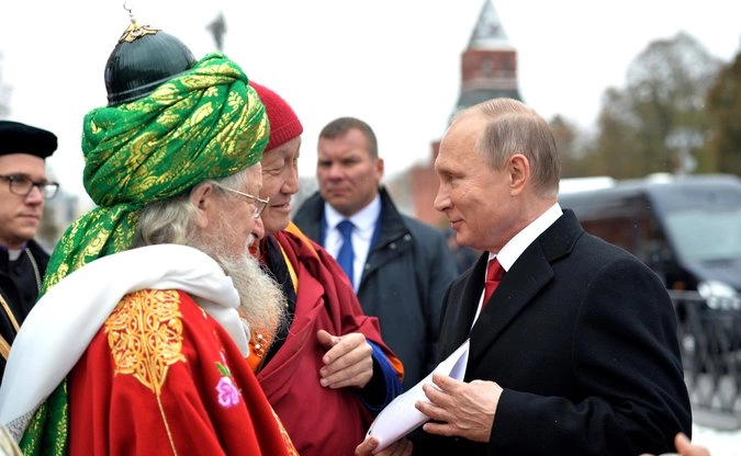 В компании патриарха Московского и всея Руси Кирилла глава государства встретился с председателем Совета муфтиев России Равилем Гайнутдиным, верховным муфтием, председателем Центрального духовного управления мусульман России Талгатом Татжуддиным, главным раввином России Берлом Лазаром, главой Русской православной старообрядческой церкви Корнелием, архиепископом, ординарием Римско-католической архиепархии Божией Матери в Москве Паоло Пецци и главой Буддийской традиционной сангхи России Дамбой Аюшеевым.