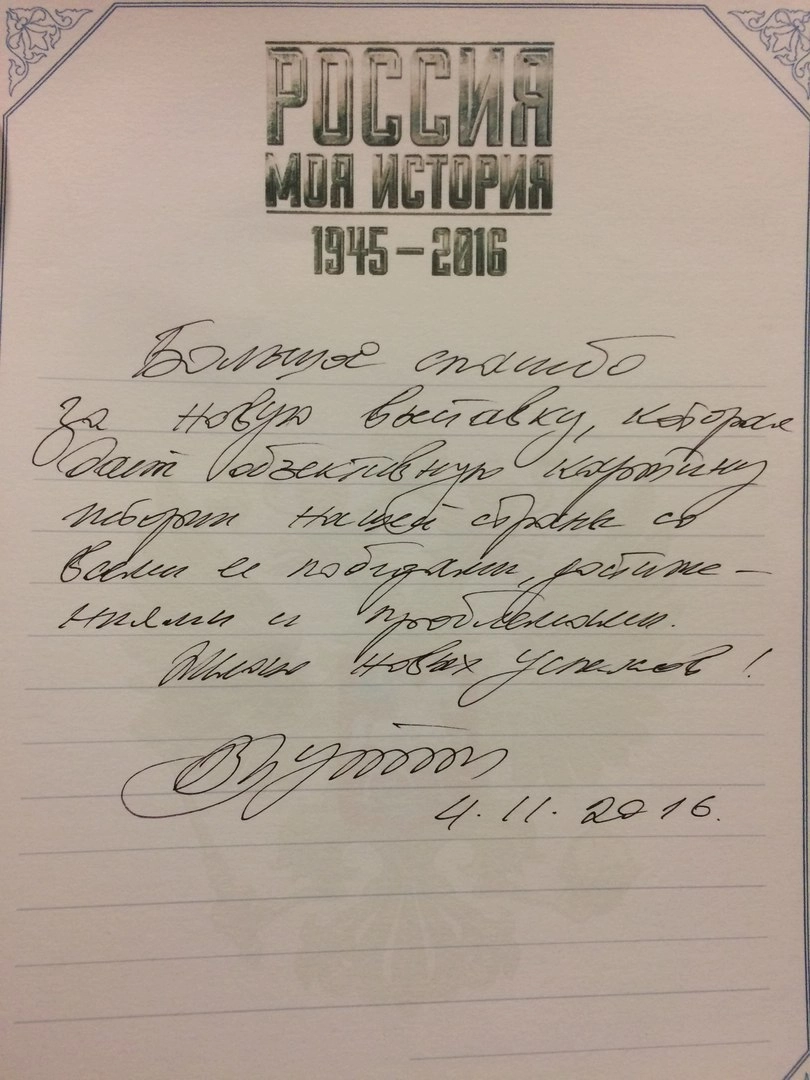 Большое спасибо за новую выставку, которая дает объективную картину истории нашей страны со всеми ее победами, достижениями и проблемами. Желаю новых успехов!написал Путин.