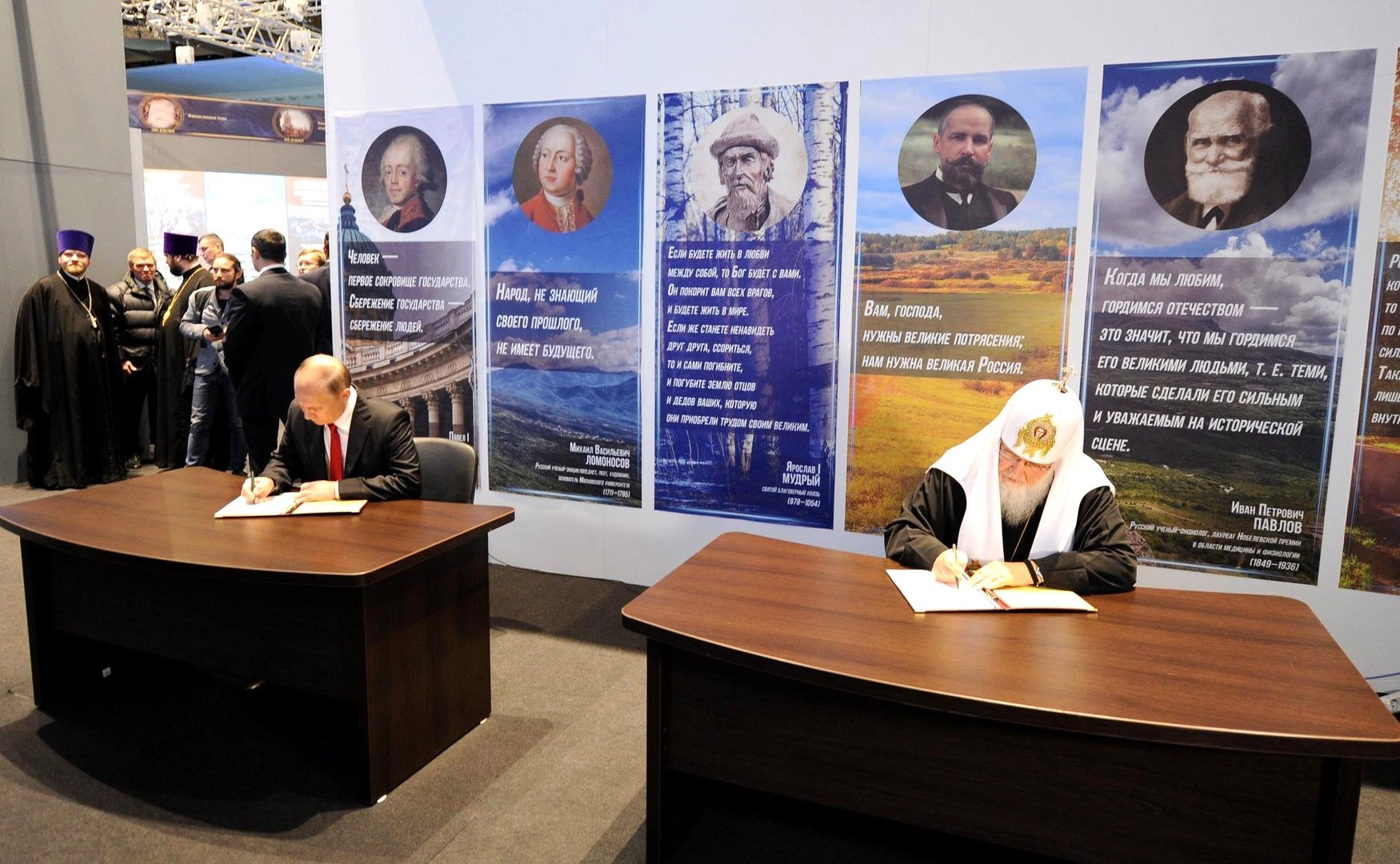 По окончании осмотра выставки-форума «Православная Русь» Владимир Путин и Патриарх Московский и всея Руси Кирилл оставили записи в книге отзывов:
